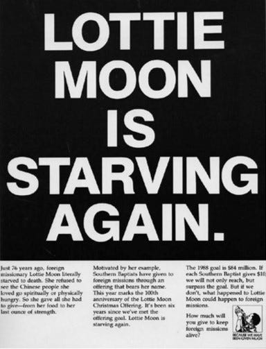 “Just 76 years ago, foreign missionary Lottie Moon literally starved to death. She refused to see the Chinese people she loved go spiritually or physically hungry. So she gave all she had to give—from her food to her last ounce of strength…The 1988 goal is $84 million. If each Southern Baptist gives $10, we will not only reach, but surpass the goal. But if we don’t, what happened to Lottie Moon could happen to foreign missions. How much will you give to keep foreign missions alive?”